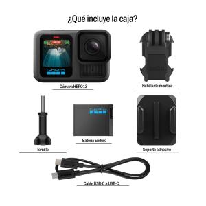 La GoPro HERO13 Black es la cámara perfecta para cualquier creador. Además de ofrecer el mejor vídeo en 5,3K60 de su clase y la legendaria durabilidad de GoPro, es compatible con las nuevas lentes serie HB. Estas lentes amplían tus capacidades de captura para realizar tomas POV (punto de vista) más envolventes, la posibilidad de enfocar más cerca que nunca y conseguir un desenfoque por movimiento mediante filtros de densidad neutra y contenido anamórfico cinematográfico. La nueva batería Enduro, más potente y duradera, prolonga el tiempo de grabación en todas las condiciones meteorológicas, mientras que el sistema de montaje actualizado ofrece a la HERO13 Black más flexibilidad de montaje que cualquier otra GoPro anterior. Con las funciones esenciales de GoPro, como la galardonada estabilización de vídeo HyperSmooth 6.0, los vídeos automáticos de momentos destacados y la posibilidad de subir automáticamente tu contenido a la nube, la HERO13 Black es una potente combinación de tecnología de vanguardia y posibilidades creativas ilimitadas.
